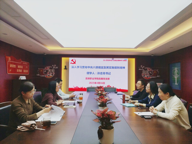 4月16日,高等职业学院直属党支部举办深入贯彻中央八项规定精神学习教育中心组理论学习会。学院领导班子成员、中心组成员参加会议。学院直属党支部书记孙志青主持会议。
