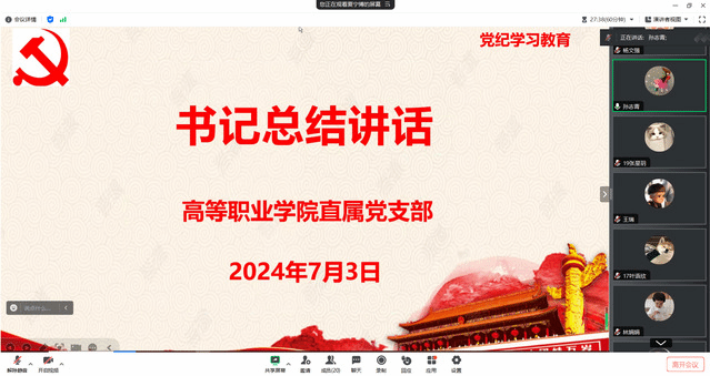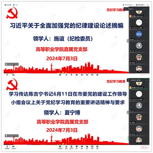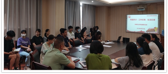 7月3日,纪检委员施谊领学了《习近平关于全面加强党的纪律建设论述摘编》,专职组织员夏宁博领学陈吉宁书记6月11日在市委党的建设工作领导小组会议上关于党纪学习教育的重要讲话精神与要求。