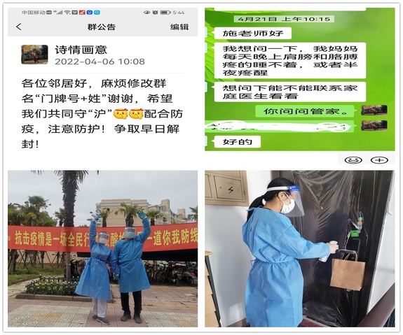 教师党员施谊老师在4月初刚封闭管理,就主动请缨参加志愿者工作,因身体原因不能打疫苗不符合申请志愿者要求,就动员非党员的爱人一起分工协作,需要外部直接接触的工作由爱人承担,夫妻两人共同做好楼栋的志愿者工作。在第一时间建立楼栋微信群,日常完成抗原领取、分发和统计,协助核酸检测,分发抗疫物资和生活物资,每日的整楼栋的楼道消毒,日常生活问题咨询等工作。本楼栋402室为一对均患癌症的老年夫妇,也不肯加入楼栋微信群,日常的抗原统计、核酸检测、物资发放等项目都是单独上门服务,在特殊时期表现出无私大爱的精神,增进了本不熟识的邻里团结互助关系,彰显了一名中共党员的责任和担当。