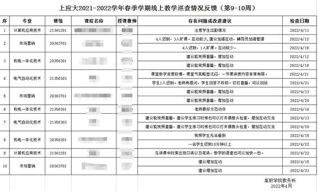 多措并举,保证教学:学院通过安排线上教学巡视、组织学生调查问卷、开展线上教学质量接待日等多途径实时掌握线上教学真实情况。根据多渠道信息汇总分析学情,每两周公布一次教学巡查结果,及时归纳整理线上教学存在的问题并引导教师合理调整、持续改进。