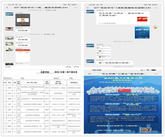 党员干部靠前,践行使命担当:3月31日,在学院直属党支部书记孙雨明和副书记、院长张东民的带领下,学院教师党员均在第一时间完成“先锋上海”线上报到工作,并积极到社区进行线下报到,投身到社区疫情防控之中;4月15日,学院9位教职工积极报名参加上海市支援市区一线疫情防控,参加报名人数占学院教职工的56%;5月10日,师生党员积极参加守土尽责“三带头”,坚决打赢大上海保卫战接力承诺活动,带头当好宣讲员、带头当好示范者、带头当好贴心人。学院党员干部积极参加社区疫情防控志愿服务工作,充分体现高职师生不畏艰难,迎头直上的担当精神,坚定履行使命的责任担当。