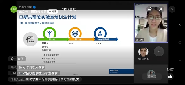 活动现场,巴斯夫上海研发中心开展了研发与项目介绍、实验室虚拟参观,投递渠道与申请流程介绍,巴斯夫企业福利介绍,Q&A+抽奖、有奖问答等环节,详细介绍了研发实验室培训生计划,并与现场学生积极互动,就学生提出的项目发展前景、培养机制、工作内容、工作环境和员工发展等问题进行耐心解答。