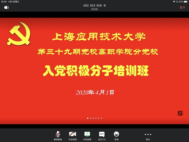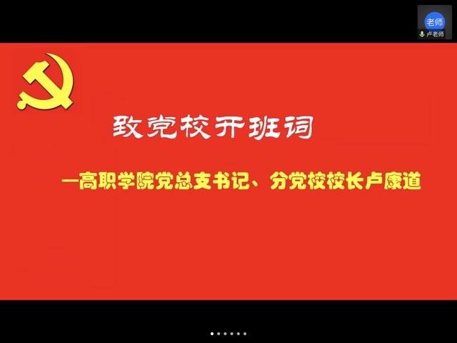 4月1日,高职学院通过“腾讯会议”平台,举行第39期分党校入党积极分子培训班开班典礼。学院党总支书记、高职分党校校长卢康道,副书记、副院长,高职分党校副校长林娟娟,相关辅导员,学生党员,以及第39期分党校全体学员参加开班典礼,会议由学院专职组织员夏宁博主持。