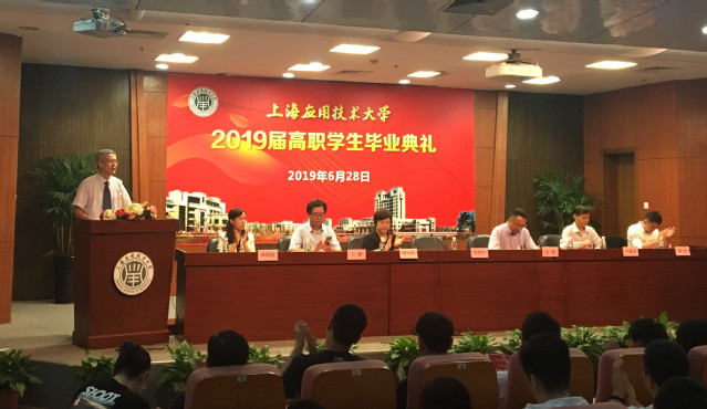 6月28日,上海应用技术大学2019届高职学生毕业典礼在徐汇校区举行。副校长张锁怀出席并讲话,学工部部长、学生处处长袁翔主持仪式,徐汇校区管委会副主任兼办公室主任范文蓓,高职学院党政领导班子成员,上海石化工业学校、上海信息技术学校负责人以及高职学院教师、辅导员、毕业生、家长代表出席本次典礼。