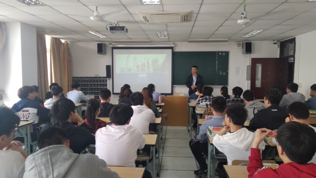 4月17日,上海华谊新材料有限公司人事经理朱黄道一行,来到上海应用技术大学长桥校区举行校园招聘宣讲会,2018级应用化工技术专业(中高职贯通)35位有应聘意向的同学参加。