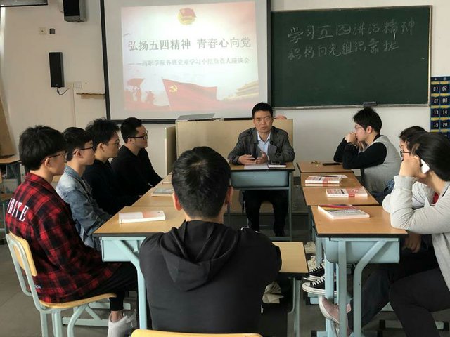 清和雅集社团指导教师吴雯婷指导学生用毛笔书写弘扬五四精神的标语口号,感悟五四时代精神;专职组织员夏宁博与各党章学习小组负责人展开座谈,同学们联系学习生活分享自己与时代共同成长的体会与感悟。