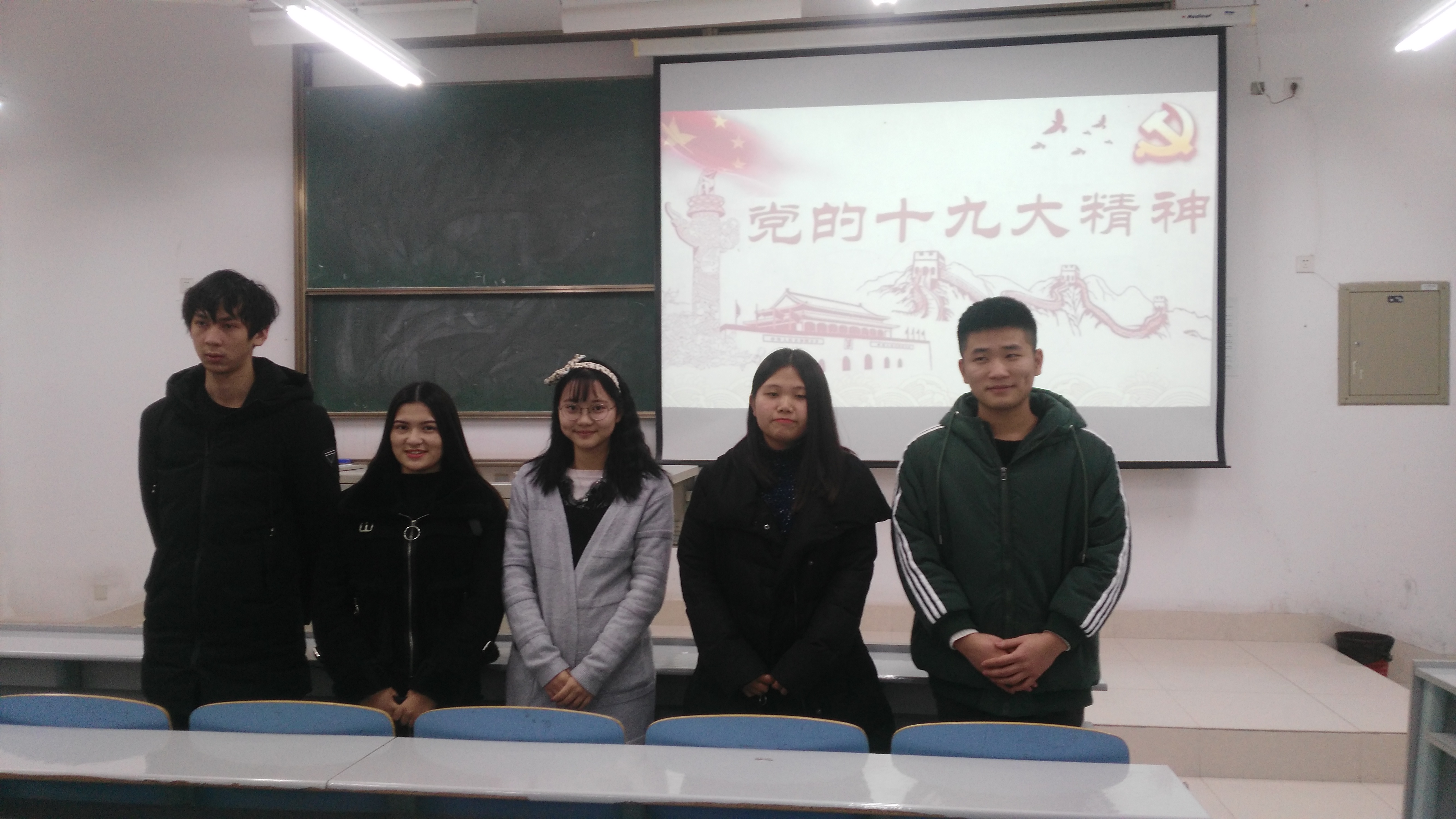 五位团支书围绕十九大精神发表自己的看法与心得。朱梦奇同学向大家详细介绍了十九大会议的主要精神与习总书记提出的新时代中国特色社会主义思想,结合大学生的思想状况,分析了作为当代大学生的我们应该怎么做。木卡旦斯•克力木江同学从自身的角度分析了十九大精神对个人成长的引领。许珠珠同学与大家分享学习十九大精神的心得体会。沈怡捷同学解读了十九大对党章做的重要修改。黄能哲同学提出了如何做一名“六有”大学生,并选播了一段2017年强国之路的视频,引发大家的共鸣。