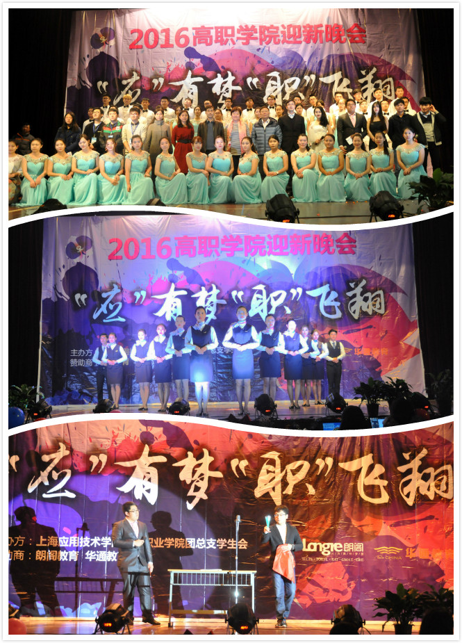 1月4日晚,高等职业学院 “应有梦•职飞翔”2016年迎新晚会在徐汇校区大礼堂举行,徐汇校区管委会办公室主任翁德明、校团委书记张化、高职学院院长杨益群、副书记(主持工作)卢康道和600多名徐汇校区师生共同参加了晚会。